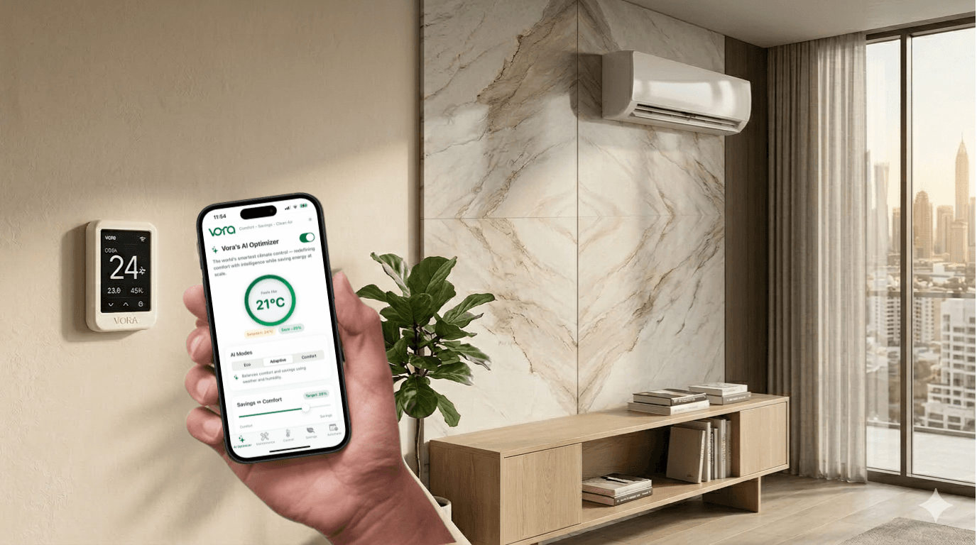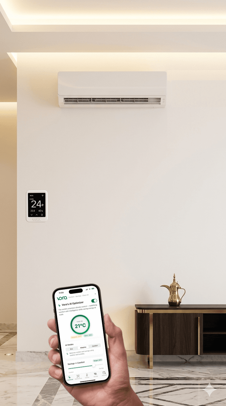 Vora optimizes any Air Conditioner (AC) using AI to cut up to 30% of cooling costs — without touching your comfort. Built for Gulf heat. Setup in 5 minutes.
